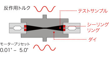 下側ダイの動作に対する反応トルクは上側ダイに装備される高分解能のストレインゲージで測定されます。このトランスデューサは試験チャンバー内の圧力も測定します。
